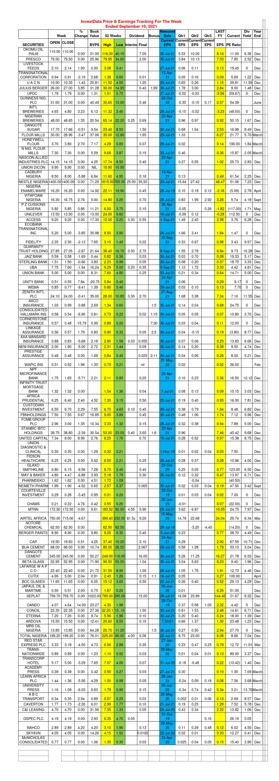 Equities Investdata Price, Earnings Tracking For Week Ended September 11, 2021 September 11, 2021 1 min read 173 Post Views: 234 Continue Reading Previous: Caution, Amid Indecision As Investors Expect News To Propel Next MoveNext: NGX Corporate Actions As Of Week Ended Friday, September 10, 2021 Trending Now SEC Nigeria Mulls Green Energy Bonds, PPPs To Tackle National Power Sector Challenges 1 SEC Nigeria Mulls Green Energy Bonds, PPPs To Tackle National Power Sector Challenges January 1, 2026 NGX Closes 2025 Strong As Late Buying Lifts Banking Stocks, Market Breadth Improves 2 NGX Closes 2025 Strong As Late Buying Lifts Banking Stocks, Market Breadth Improves December 31, 2025 Presco Plc Says 103% Rights Issue Subscription Level Sign Of Strong Investor Confidence 3 Presco Plc Says 103% Rights Issue Subscription Level Sign Of Strong Investor Confidence December 31, 2025 Oil Prices Hold Steady On Tuesday Amid Global Tensions 4 Oil Prices Hold Steady On Tuesday Amid Global Tensions December 31, 2025 Nigerian Equities Sustain Rally As Liquidity, Sector Rotation Support Gains 5 Nigerian Equities Sustain Rally As Liquidity, Sector Rotation Support Gains December 30, 2025 UPDC 2025-9months: It’s a Hold, Amid Rising Profit, Shrinking Margins, Galloping Share Price Post-Turnaround 6 UPDC 2025-9months: It’s a Hold, Amid Rising Profit, Shrinking Margins, Galloping Share Price Post-Turnaround December 30, 2025 Related Stories NGX Closes 2025 Strong As Late Buying Lifts Banking Stocks, Market Breadth Improves 5 min read Equities NGX Closes 2025 Strong As Late Buying Lifts Banking Stocks, Market Breadth Improves December 31, 2025 79 Nigerian Equities Sustain Rally As Liquidity, Sector Rotation Support Gains 5 min read Equities Nigerian Equities Sustain Rally As Liquidity, Sector Rotation Support Gains December 30, 2025 119 Nigerian Stocks Extend Santa Claus Rally As Composite Index Hits Fresh High 5 min read Equities Nigerian Stocks Extend Santa Claus Rally As Composite Index Hits Fresh High December 29, 2025 226 Corporate Actions On Nigerian Bourse As Of Wednesday, December 24, 2025 1 min read Equities Corporate Actions On Nigerian Bourse As Of Wednesday, December 24, 2025 December 27, 2025 181 NGX Ends Christmas Eve Higher As Banking, Consumer Stocks Advance 5 min read Equities NGX Ends Christmas Eve Higher As Banking, Consumer Stocks Advance December 24, 2025 287 NGX Sustains Bullish Momentum As Buying Pressure Keeps Market On The Upside 5 min read Equities NGX Sustains Bullish Momentum As Buying Pressure Keeps Market On The Upside December 23, 2025 216