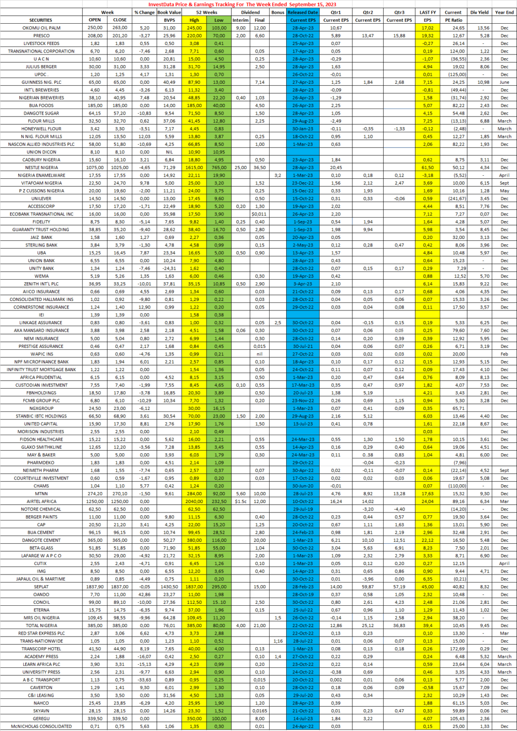 Equities Investdata Price, Earnings Tracking For Week Ended September 15, 2023 Editor September 16, 2023 1 min read 381 Post Views: 134 Continue Reading Previous: Mixed Trends Ahead On NGX, As Reactions To Shake Up At CBN May Dampen Earnings NewsNext: Corporate Actions On NGX As Of Friday, September 15, 2023 Trending Now Nigerian Bourse Ranges On Profit Taking Ahead Earnings Expectations, Sector Rotation 1 Nigerian Bourse Ranges On Profit Taking Ahead Earnings Expectations, Sector Rotation January 24, 2026 Corporate Actions On NGX As Of Friday, January 23, 2026 2 Corporate Actions On NGX As Of Friday, January 23, 2026 January 24, 2026 NGX Ends Week On Cautious Positive Note As Selective Buying Offsets Profit-Taking Pressures 3 NGX Ends Week On Cautious Positive Note As Selective Buying Offsets Profit-Taking Pressures January 24, 2026 NGX Ends Bearish On Heavyweight Selloffs Amid Cautious Sentiment 4 NGX Ends Bearish On Heavyweight Selloffs Amid Cautious Sentiment January 23, 2026 Oil Slides as Geopolitical Tensions Ease, But Supply Concerns Linger 5 Oil Slides as Geopolitical Tensions Ease, But Supply Concerns Linger January 23, 2026 BUA Cement, CBMI Seal US$240m Deal For 3mtpa Sokoto Plant Expansion In 20 Months 6 BUA Cement, CBMI Seal US$240m Deal For 3mtpa Sokoto Plant Expansion In 20 Months January 22, 2026 Related Stories Corporate Actions On NGX As Of Friday, January 23, 2026 1 min read Equities Corporate Actions On NGX As Of Friday, January 23, 2026 January 24, 2026 40 NGX Ends Week On Cautious Positive Note As Selective Buying Offsets Profit-Taking Pressures 3 min read Equities NGX Ends Week On Cautious Positive Note As Selective Buying Offsets Profit-Taking Pressures January 24, 2026 53 NGX Ends Bearish On Heavyweight Selloffs Amid Cautious Sentiment 2 min read Equities NGX Ends Bearish On Heavyweight Selloffs Amid Cautious Sentiment January 23, 2026 142 Cautious Bargain Hunting Lifts Equities Marginally Amid Mixed Sector Performance 3 min read Equities Cautious Bargain Hunting Lifts Equities Marginally Amid Mixed Sector Performance January 22, 2026 153 Nigerian Equities Post Modest Rebound As Bargain Hunting, Oil Strength Support Market 3 min read Equities Nigerian Equities Post Modest Rebound As Bargain Hunting, Oil Strength Support Market January 21, 2026 191 Nigerian Equities End Flat-To-Bearish As Profit Taking Offsets Broad Buying, Composite Index Holds Key Support 3 min read Equities Nigerian Equities End Flat-To-Bearish As Profit Taking Offsets Broad Buying, Composite Index Holds Key Support January 20, 2026 195