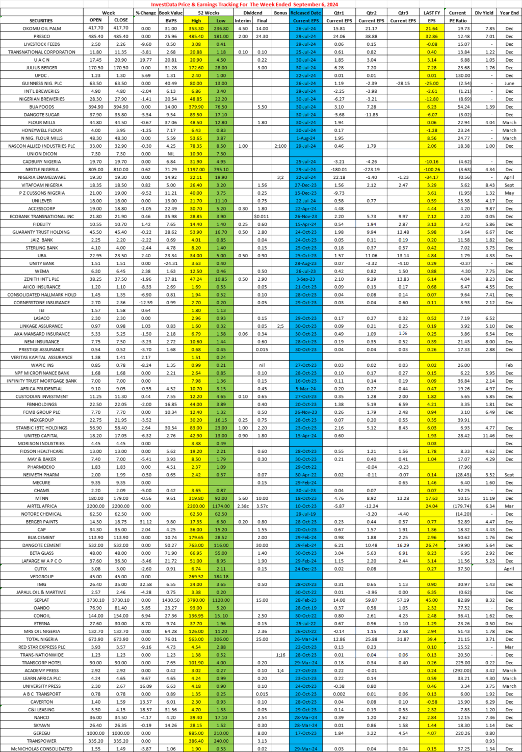 Equities Investdata Price, Earnings Tracking For Week Ended September 6, 2024 Editor September 7, 2024 1 min read 230 Post Views: 96 Continue Reading Previous: Price Corrections On NGX Offer Bargain Hunters Potentials To Buy CheapNext: Corporate Actions On NGX As Of Friday, September 6, 2024 Trending Now SEC Nigeria Gives Capital Market Operators January 31 Deadline To Renew Registration 1 SEC Nigeria Gives Capital Market Operators January 31 Deadline To Renew Registration December 21, 2025 Investdata To Offer Tactical Trading Strategy For Higher Returns On NGX At 2026Q1 Master Class 2 Investdata To Offer Tactical Trading Strategy For Higher Returns On NGX At 2026Q1 Master Class December 20, 2025 Corporate Actions On NGX As Of Friday, December 19, 2025 3 Corporate Actions On NGX As Of Friday, December 19, 2025 December 20, 2025 Strong Buying Momentum Lifts NGX Index Above 152,000 Psychological Line On Heavy Volume 4 Strong Buying Momentum Lifts NGX Index Above 152,000 Psychological Line On Heavy Volume December 20, 2025 NGX Stretches Winning Streak To Seven Sessions As Broad Buying Keeps Bulls In Control 5 NGX Stretches Winning Streak To Seven Sessions As Broad Buying Keeps Bulls In Control December 19, 2025 Otedola Raises First HoldCo Plc Stake To 17.04% In Latest Deals 6 Otedola Raises First HoldCo Plc Stake To 17.04% In Latest Deals December 19, 2025 Related Stories Corporate Actions On NGX As Of Friday, December 19, 2025 1 min read Equities Corporate Actions On NGX As Of Friday, December 19, 2025 December 20, 2025 71 NGX Stretches Winning Streak To Seven Sessions As Broad Buying Keeps Bulls In Control 3 min read Equities NGX Stretches Winning Streak To Seven Sessions As Broad Buying Keeps Bulls In Control December 19, 2025 166 NGX Maintains Uptrend As Investors Accumulate Blue Chips Despite Slower Trading Activity 3 min read Equities NGX Maintains Uptrend As Investors Accumulate Blue Chips Despite Slower Trading Activity December 18, 2025 166 Cautious Buying Persists As Select Stocks Drive Marginal Market Upside 4 min read Equities Cautious Buying Persists As Select Stocks Drive Marginal Market Upside December 16, 2025 116 NGX Edges Higher Amid Selective Buying, Market Consolidates Near Recent Highs 3 min read Equities NGX Edges Higher Amid Selective Buying, Market Consolidates Near Recent Highs December 15, 2025 169 Corporate Actions On NGX As Of Friday, December 11, 2025 1 min read Equities Corporate Actions On NGX As Of Friday, December 11, 2025 December 13, 2025 201
