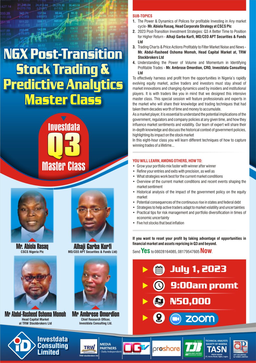 Training Investdata’s Master Class On NGX Post-Transition Outlook Holds Saturday July 1 Editor June 24, 2023 1 min read 277 Post Views: 52 Continue Reading Previous: Macallan Partners Atafo To Mentor 40 Young Nigerian Fashion DesignersNext: Experts To Speak On NGX Post-Transition Outlook, As Investdata’s Master Class Holds Saturday Trending Now NGX Ends Bearish On Heavyweight Selloffs Amid Cautious Sentiment 1 NGX Ends Bearish On Heavyweight Selloffs Amid Cautious Sentiment January 23, 2026 Oil Slides as Geopolitical Tensions Ease, But Supply Concerns Linger 2 Oil Slides as Geopolitical Tensions Ease, But Supply Concerns Linger January 23, 2026 BUA Cement, CBMI Seal US$240m Deal For 3mtpa Sokoto Plant Expansion In 20 Months 3 BUA Cement, CBMI Seal US$240m Deal For 3mtpa Sokoto Plant Expansion In 20 Months January 22, 2026 Cautious Bargain Hunting Lifts Equities Marginally Amid Mixed Sector Performance 4 Cautious Bargain Hunting Lifts Equities Marginally Amid Mixed Sector Performance January 22, 2026 Oil Prices Tick Up On Kazakhstan Supply Disruptions 5 Oil Prices Tick Up On Kazakhstan Supply Disruptions January 22, 2026 Nigerian Equities Post Modest Rebound As Bargain Hunting, Oil Strength Support Market 6 Nigerian Equities Post Modest Rebound As Bargain Hunting, Oil Strength Support Market January 21, 2026 Related Stories Investdata To Offer Tactical Trading Strategy For Higher Returns On NGX At 2026Q1 Master Class 1 min read Training Investdata To Offer Tactical Trading Strategy For Higher Returns On NGX At 2026Q1 Master Class December 20, 2025 189 Investdata Hosts Flagship ‘Invest 2026 Traders & Investors Summit’ December 6 1 min read Training Investdata Hosts Flagship ‘Invest 2026 Traders & Investors Summit’ December 6 November 22, 2025 42 Invest 2026 Summit: Traders, Analysts To Examine Pre-Election Year Investment Opportunities, Risks 1 min read Training Invest 2026 Summit: Traders, Analysts To Examine Pre-Election Year Investment Opportunities, Risks November 15, 2025 54 Investdata Consulting Holds Q4 Master Class September 27 1 min read Training Investdata Consulting Holds Q4 Master Class September 27 September 7, 2025 43 3 min read Training June 27, 2025 157 Investdata Consulting Holds 2025Q3 Master Class June 28 1 min read Training Investdata Consulting Holds 2025Q3 Master Class June 28 June 14, 2025 95