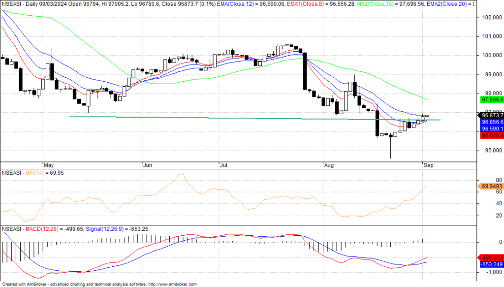 Market technicals for the session were negative and mixed with lower volume when compared to the previous session in the midst of breadth favoring the bears on a mixed sentiment as revealed by Investdata’s Sentiments Report showing 41% buy position and 59% sell volume. The total transaction volume index stood at 0.88 points, just as energy behind the day’s performance was relatively strong as Money Flow Index was up to read 69.95pts, from the previous day’s 64.54pts, indicating that funds entered the market.