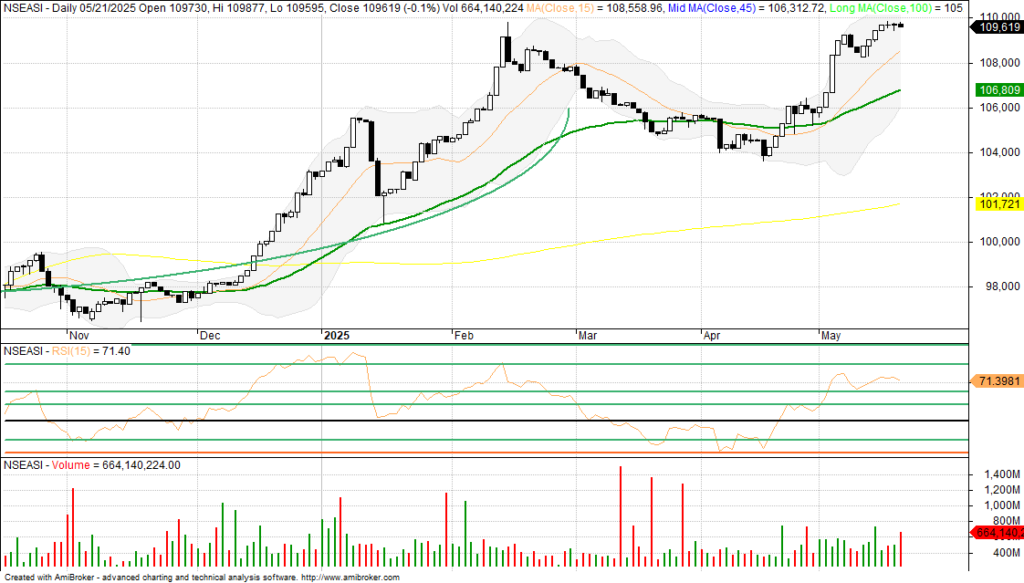 Midweek’s trading started in the upside but pulled back at midday on profit taking which was sustained throughout the session, on selling pressure in banking stocks and others, while positioning in others. This situation pushed the NGX’s index to intra-day low of 109,595.40bps from its highs of 109,877.10bps, before closing below its opening level at 109,619.10bps.