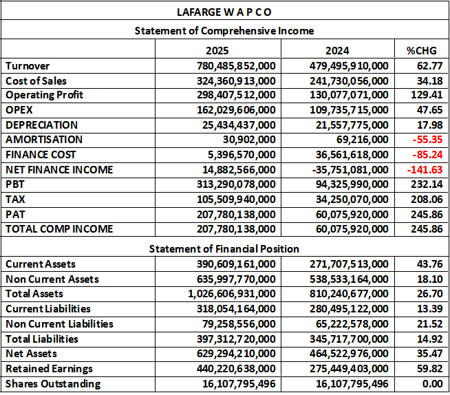Lafarge Africa in 2025 is financially stronger, more profitable, more efficient, and strategically better positioned than in 2024. The turnaround is supported by fundamentals, not one-off events. Investor sentiment and valuation metrics confirm that the company is in a growth and re-rating phase.