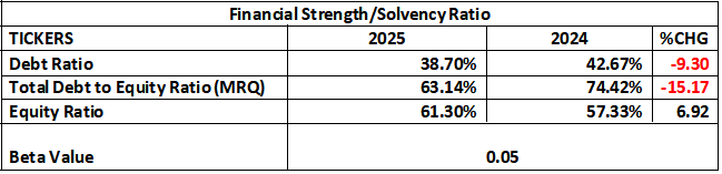 Debt Ratio: As shown in the table below, the ratio trended marginally south- from the previously estimated 42.67% to 38.70%. A lower debt ratio indicates that a smaller portion of the company’s assets are financed by liabilities.