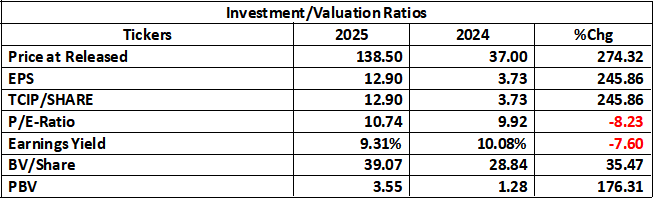 The 2025 valuation metrics show a company experiencing strong earnings growth, increased investor demand, and a rerating of share value, although the P/E and earnings yield show mild compression due to higher market price.