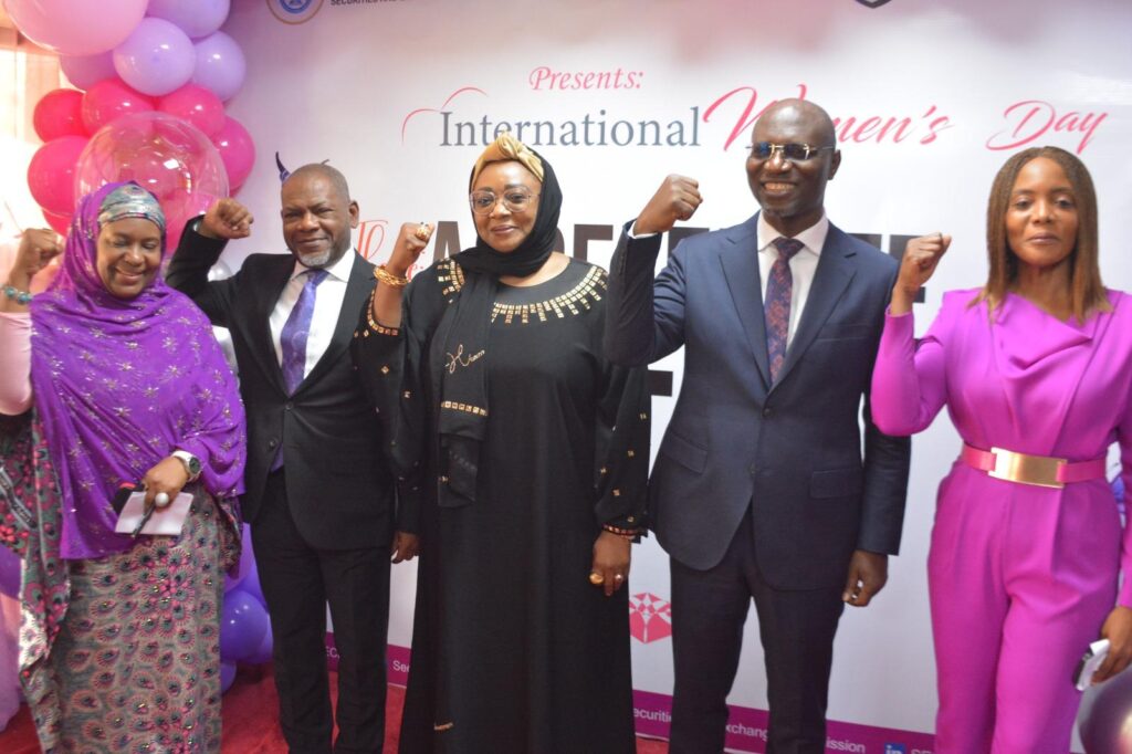 Caption: From left, Executive Commissioner Legal and Enforcement Securities and Exchange Commission (SEC), Ms. Frana Chukwuogor; Director–General of the commission, Dr. Emomotimi Agama; Minister for Women Affairs, Hajia Imaan Suleiman-Ibrahim; Executive Commissioner, Corporate Services, SEC, Mrs. Samiya Usman; and Executive Commissioner, Operations, SEC, Bola Ajomale; during the commemoration of the International Women’s Day 2025 by the SEC in Abuja on Thursday.