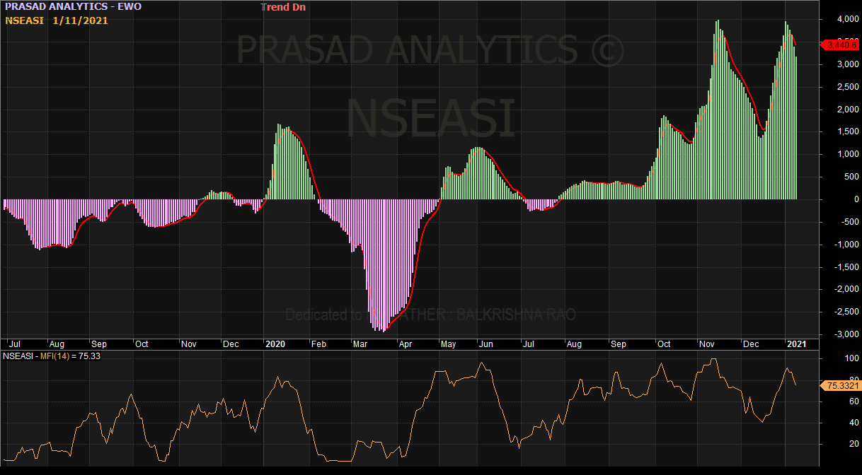 Market technicals for the day were positive and mixed with volume traded higher than the previous day’s in the midst of positive breadth and high buying pressure as revealed by Investdata’s Sentiments Report showing 100% ‘buy’ volume. This was on a total transaction volume index of 0.87 points, just as the impetus behind the day’s performance remained strong, with Money flow index looking down at 75.33pts, from the previous day’s 81.19pts, indicating that funds left the market, despite closing marginally high.