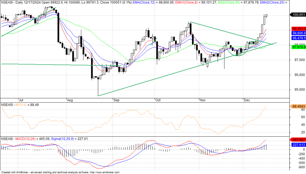The positive momentum on the Nigerian Exchange continued in the face of mixed session on Tuesday, as the benchmark NGX All-Share index closed higher on a low traded volume and negative market intervals, due to profit taking in some sectors while buying interest across mid and high cap stocks supported the key performance index. This extended the bull rally for the six consecutive sessions on the back of funds entering the market to drive the ongoing Santa Claus rally that is associated with year-end seasonality and sentiment. The index action forming a top reversal chart pattern in the midst of buying sentiment, looks somewhat at this point. So, players needs confirm the next direction after breaking out the 100,000 psychological line.