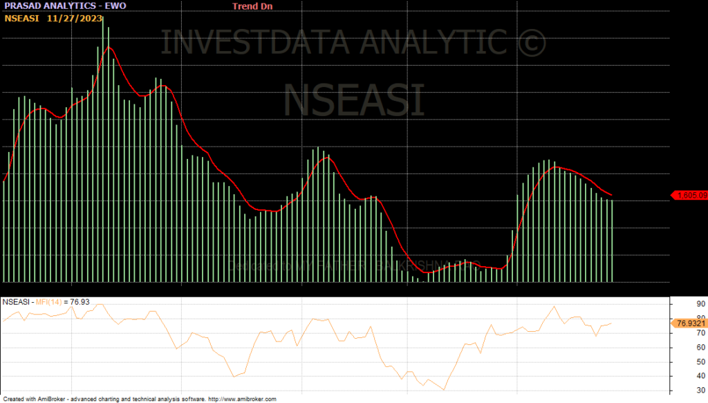 Market technicals were positive and strong with a higher volume traded, when compared to the previous session, in the midst of breadth favoring the bulls on a buying sentiment as revealed by Investdata’s Sentiments Report showing 72% buy position and 28% sell volume. The total transaction volume index stood at 1.74 points, just as the momentum behind the day’s performance was strong, with Money Flow Index looking up to read 76.93pts, from the previous day’s 75.87pts, indicating that funds entered the market.
