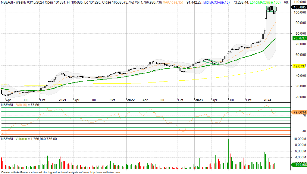 The NGX index’s action witnessed its rally to continue the uptrend and positive outing, breaking out the strong resistance levels and psychological lines while testing 105,085 that extended the markup phase and recovery move on the weekly chart. We noted that the 106,000 mark as a strong resistance level on the daily and weekly time frame. The market is at critical zone as all eyes are on the banks financials to support market fundamentals and attract inflow again. Also, we note that investors are taking long-term positions in the face of dividend expectation and volatility. Amid position taking by dividend investors now increasing their holdings in the midst of uptrend.