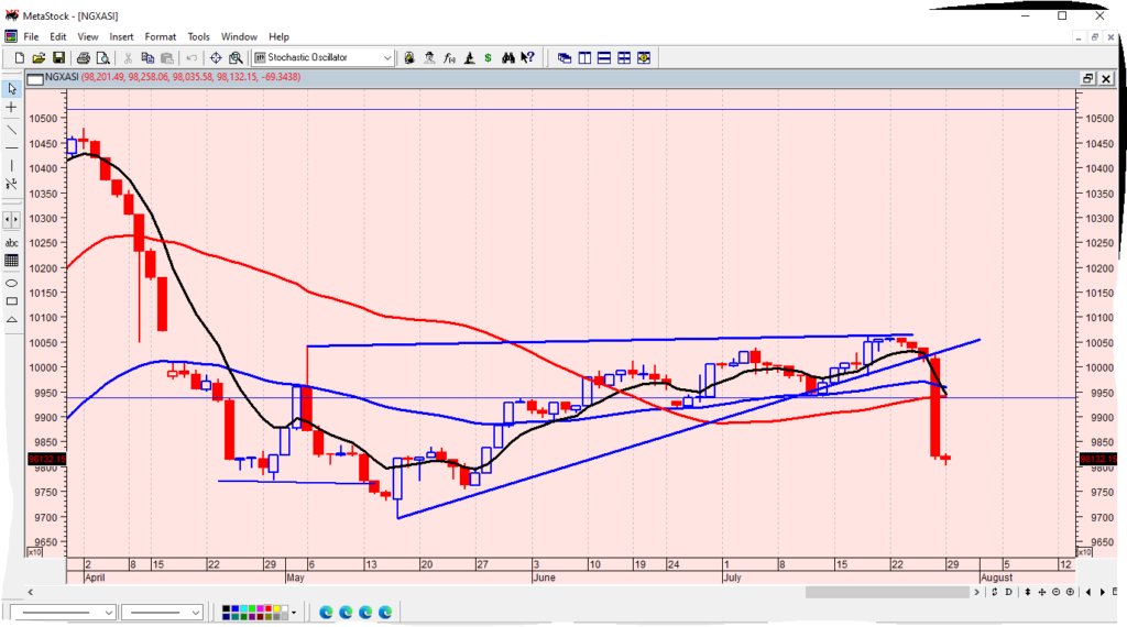 The NGX index’s action remains below the T-line, while the two moving averages of 50-EMA and 50-SMA are indicating weakness in the midst of changing market fundamentals and technicals.