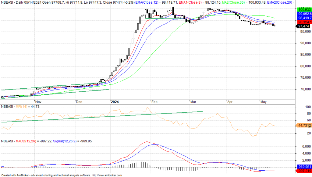 The bear-run continued on the Nigerian Exchange Tuesday, as the benchmark NGX All-Share index closed lower once more, breaking down the critical support level of 97,689.04 basis points on a low traded volume and positive market breadth in the face of persistent sell sentiments and expected corporate earnings especially from insurance companies, and on the back of expected macroeconomic data. All eyes are still on the April Consumer Price Index scheduled for release on Wednesday, ahead of next week’s fixed income primary market auctions and the meeting of the Central Bank of Nigeria’s Monetary Policy Committee on Monday and Tuesday. The market is also expecting the Q1 GDP report that will reveal the state of the nation’s economy in the first three months of 2024.