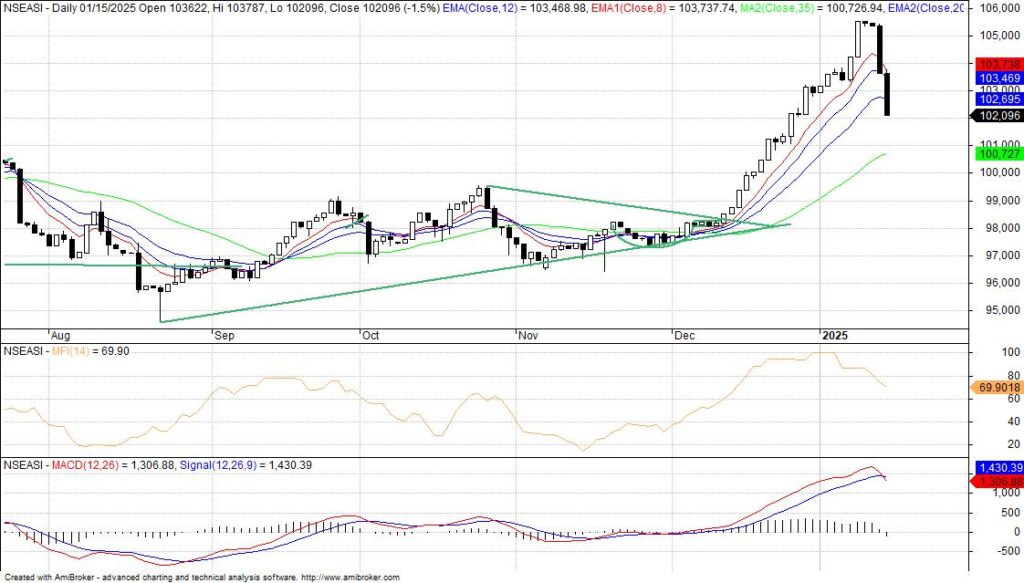 Money flow and other momentum tools were down, presenting buy opportunities for traders who understand the importance of buying low and selling high in any market condition in the midst ongoing volatility and selling sentiment. As the index is set to breakdown the 102,096.40bps level to sustain downtrend, thereby creating the perfect setup for high probability of continuation to catch new year repositioning at the right price. Also, as the index trades below the T-line and above the two moving averages of 50-EMA and 50-SMA, this indicates weakness in the midst of changing market fundamentals and technicals on the NGX and the economy.
