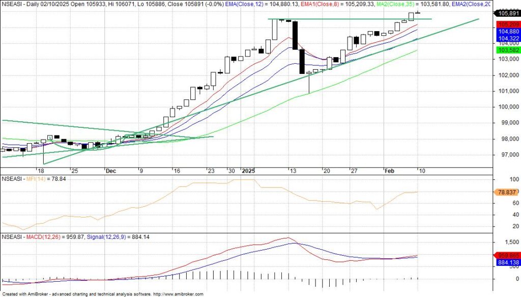 Profit taking resurfaced on the Nigerian Exchange on Monday to start the week on a selling sentiment that hit banking stocks and others, thereby halting five consecutive sessions of bull transition. The index’s action resisting to breakout the all-time high of 106,087.80 basis points after testing 106,071.40bps to pull back on profit booking. Despite the buying interest across some major sectors of the market, as the benchmark NGX All-Share index closed lower on above average traded volume and positive market internals.