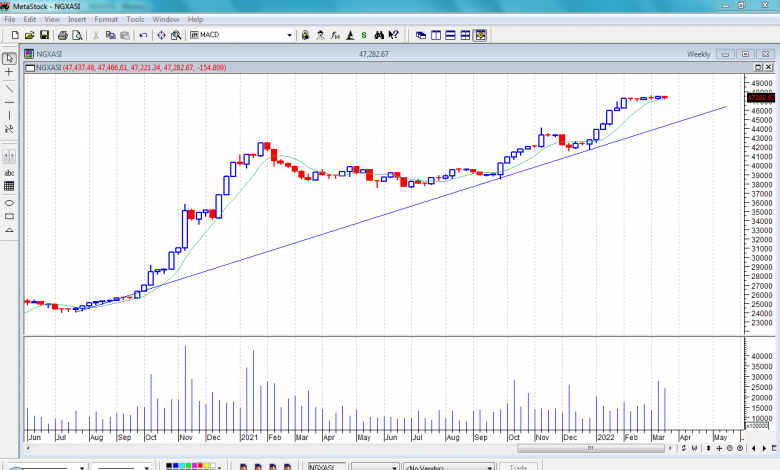 The NGX’s index action sustained an up market on a weekly time frame, despite the sideways movement after pulling back on a selling sentiment to trade on top of the seven-day moving average and above the 47,000 points to test the 47,466.61 basis points. The candlestick formation, at the end of the week showed that sellers are in charge at a time the release of more 2021 audited financials is expected to give a direction. The candlestick pattern indicates a possible continuation of the trend, depending on market forces in the new week. Meanwhile, market recovery is still strong. Also, all eyes are on the fixed income market yields and oil prices to further support market fundamentals and attract liquidity to the equity space. The NGX at this point is creating new buying opportunities for dividend income investors.