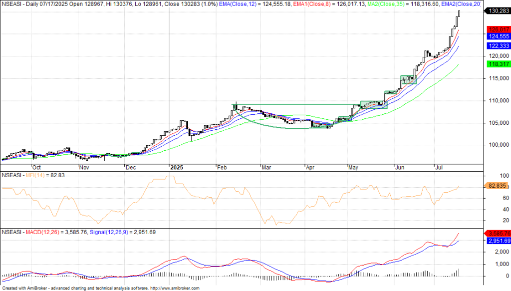 The bullish ascendance continued on the Nigerian Exchange continued on Thursday, following increased buying interest in highly capitalized stocks among others, a situation that weighed positively on the benchmark NGX All-Share index as it closed higher on a high traded volume in the midst of negative market breadth and buying sentiment. The market and some major sectoral indexes made yet another new all-time high boosted by gains recorded in Dangote Cement, BUA Cement and host of others which broadened the NGX momentum lifting over the psychological lines of 129,000 and 130,000 to test 130.375.90 basis points. The composite index however settled at 130,283bps on negative market internals that indicates that a weakening market and pullback is underway, due to the ongoing profit taking ahead of the half-year earnings season.
