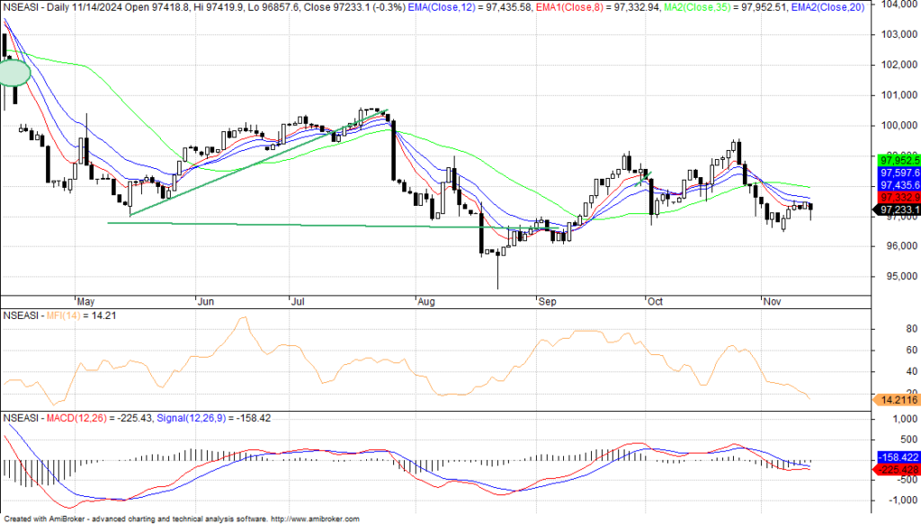The buying sentiment in the midst of bullish hammer reversal chart pattern and retracement which needs confirmation as trading opens on Friday. This retracement from support level of 96,857.60 basis points and 97,378.62bps, after forming a bottoming-tail and hammer candle in a pullback. This created the perfect setup for high probability of uptrend to catch end of year repositioning. Also, the index is trading below the T-line and the two moving averages of 50-EMA and 50-SMA, this indicate relatively weak momentum and somewhat in the midst of changing market fundamentals and technicals on the NGX and the economy.
