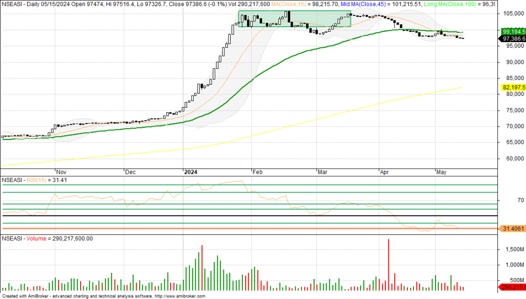 The composite NGXASI closed lower, thereby extending its bearish transition for the fourth consecutive trading session in the face of low traded volume, negative market breadth and mixed sentiments, ahead of next week’s meeting of the Monetary Policy Committee.The market is also expecting more corporate earnings inflow and Q1 GDP report that will reveal the state of the nation’s economy in the first three months of 2024.
