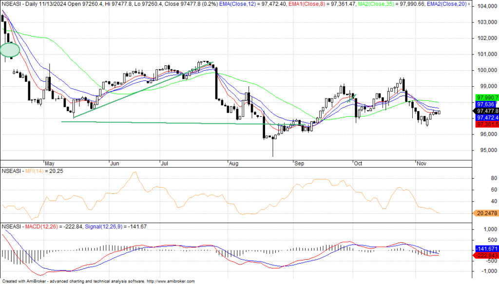 The buying pressure in the face of top reversal chart pattern and retracement which needs confirmation as trading opens on Thursday. This retracement from support level of 97,215.17 basis points and 97,378.62bps, after forming a topping-tail and hammer candle in an uptrend on Tuesday. This created the perfect setup for high probability of uptrnd to catch end of year repositioning. Also, the index is trading above the T-line but below the two moving averages of 50-EMA and 50-SMA, this indicate relatively weak momentum and somewhat in the midst of changing market fundamentals and technicals on the NGX and the economy.