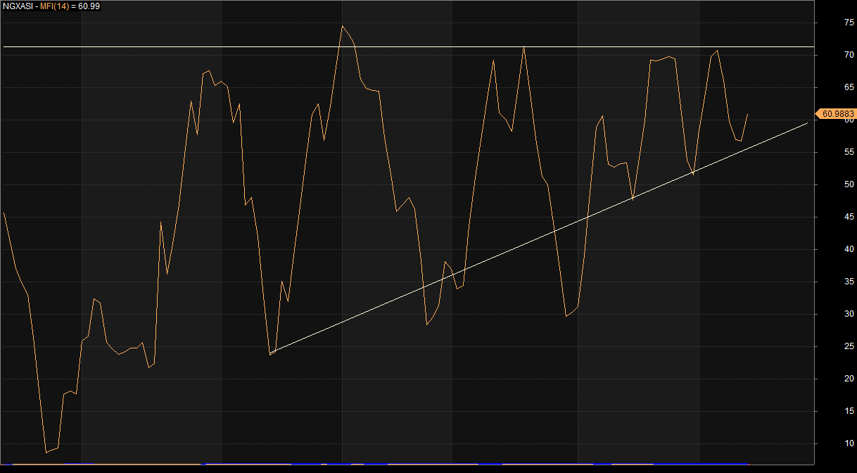 The mixed sentiment observed at the end of Thursday’s trading reflected the mood of sellers and buyers battling for dominance as revealed by the candlestick pattern and investdata sentiment report. Also, we note that the divergence between the index and volume action have been corrected by the day’s very high traded volume while money flow index turned up, an indication that funds entered the market to sustain the positive outing for the third consecutive session.