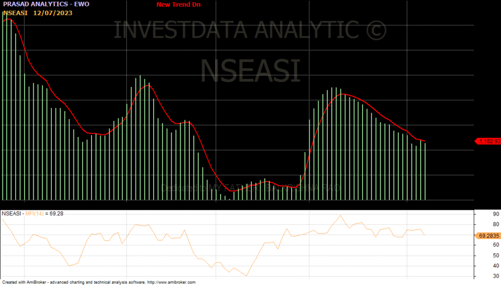 Market technicals were negative and mixed with a lower volume traded, when compared to the previous session, in the midst of breadth that favoured the bears on a selling sentiment as revealed by Investdata’s Sentiments Report showing 9% buy position and 91% sell volume. The total transaction volume index stood at 0.93 points, just as the impetus behind the day’s performance was strong, with Money Flow Index looking down to read 69.28pts, from the previous day’s 75.66pts, indicating that funds left the market.