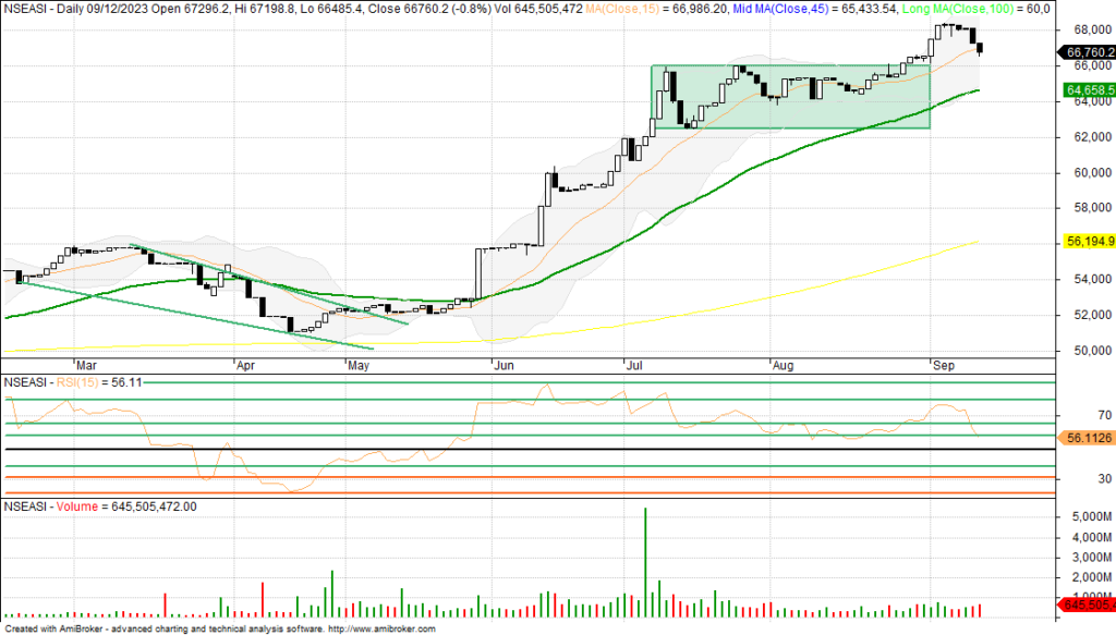 The NGX All-Share index at the end of Tuesday’s trading broke down another support level and psychological line of 67,000 to test 66,485.40 basis points as it continues on the decline phase to trade below the T-line, having formed a hammer candlestick that indicates reversal underway. However, let us wait to confirm the strong support level, as the 2008 resistance level turns another support to watch out for.