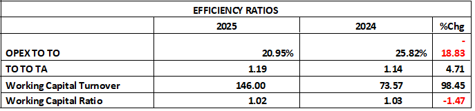 Overall Efficiency Verdict: The Strengths observed here are: a significant improvement in cost efficiency (OPEX/TO ↓), better asset utilization, and and exceptional working capital efficiency. On the other hand, the Watch Areas are: Tight liquidity position (Current ratio ~1.0x), and the fact that the extremely high Working Capital turnover may signal pressure on working capital. Else, we agree that NAHCO demonstrates: Efficient operations, strong cost management, and Improved capital utilization.