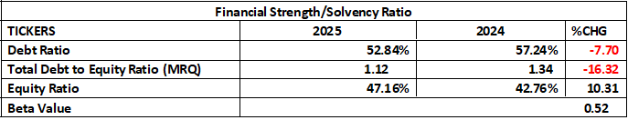 - Debt Ratio: 2025 at 52.84%, and 2024: 57.24%, a change of negative 7.70%, is an indication that total liabilities now fund a smaller portion of assets which can be interpreted as: Reduced in financial risk, improved balance sheet quality, and stronger asset backing by equity.