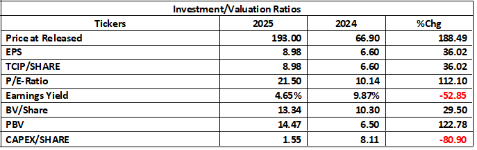 - P/E Ratio: 2025: 21.50x and 2024: 10.14x for a percentage change of positive 112.10%: Valuation has expanded sharply. Meaning that, investors are paying more than double for the same ₦1 earnings. The stock is becoming expensive. Nevertheless, it can also be interpreted as heightened investors’ confidence in the company’s shares.