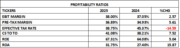 - Return on Assets (ROA): 2025: 31.75% and 2024: 27.40% for a positive change of 15.87%: Again this is very impressive which can be explained as strong asset utilization, and high efficiency in generating profits from assets