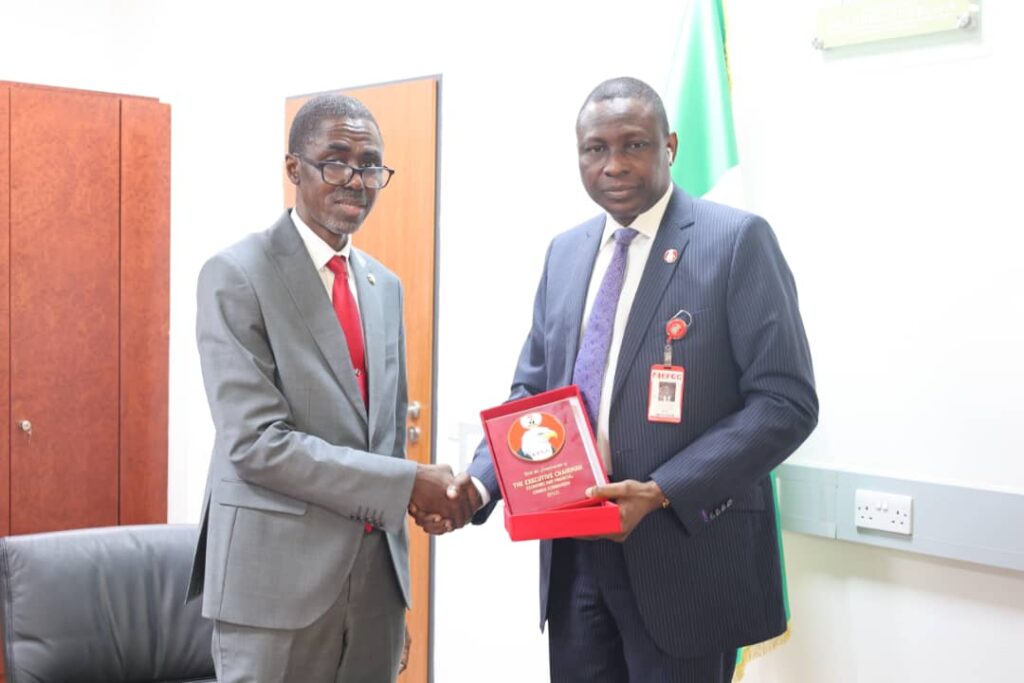 - MD/CE of the Nigeria Deposit Insurance Corporation (NDIC), Bello Hassan receives a commemorative plaque from the Chairman of the Economic & Finance Crimes Commission (EFCC), Ola Olukoyede during the NDIC management’s visit to the EFCC Headquarters in Abuja.