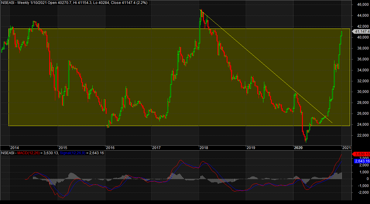 The NSE benchmark broke out the 41,000 resistance level, following which there is the high possibility of this trend continuing ahead of the full-year earnings reporting season in 2021, notwithstanding the fear of the January effect. This is because there are no other investment windows offering returns above the nation’s inflation rate, especially against the backdrop of the twin major factors of low interest rates in fixed income instruments and rising oil prices currently supporting the bull market.