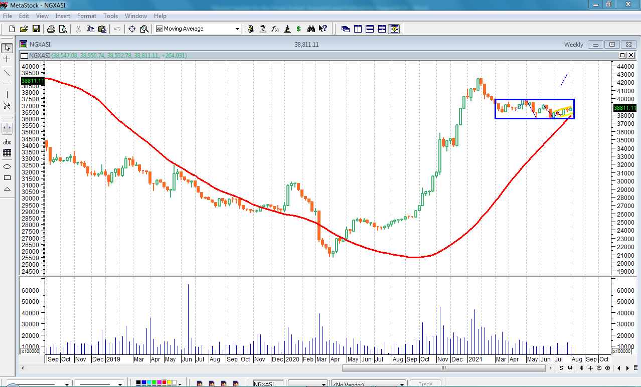 From the opening chart, the NGX index action has formed a rectangle chart pattern of consolidation on a weekly time frame, with the candlestick formation indicating that buyers are still in charge but we need a confirmation next week to give direction, after forming a rectangle that supports a continuation of trend and reversal, after the just conclude earnings season. Already, the daily chart has confirmed indecision among traders.