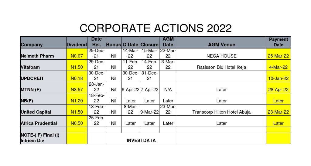 Equities NGX Corporate Actions As Of Friday, February 25, 2022 February 26, 2022 1 min read 266 Post Views: 420 Continue Reading Previous: Investdata Price, Earnings Tracking For Week Ended February 25, 2022Next: Expect Bullish Sentiments This Week, On More audited Earnings, Dividend News Trending Now Oil Holds Steady Amid Geopolitical Risks, Surplus Outlook 1 Oil Holds Steady Amid Geopolitical Risks, Surplus Outlook December 16, 2025 NGX Edges Higher Amid Selective Buying, Market Consolidates Near Recent Highs 2 NGX Edges Higher Amid Selective Buying, Market Consolidates Near Recent Highs December 15, 2025 BUA Group Doles Out ₦30bn Cash Awards To 510 Employees 3 BUA Group Doles Out ₦30bn Cash Awards To 510 Employees December 15, 2025 Oil Prices Slide On Oversupply Concerns, Post 4% Weekly Loss 4 Oil Prices Slide On Oversupply Concerns, Post 4% Weekly Loss December 15, 2025 Nigerian Index Extends Two-Week Strong Buying Interests On Low Cap Stocks, Blue-Chip Gains 5 Nigerian Index Extends Two-Week Strong Buying Interests On Low Cap Stocks, Blue-Chip Gains December 13, 2025 Corporate Actions On NGX As Of Friday, December 11, 2025 6 Corporate Actions On NGX As Of Friday, December 11, 2025 December 13, 2025 Related Stories NGX Edges Higher Amid Selective Buying, Market Consolidates Near Recent Highs 3 min read Equities NGX Edges Higher Amid Selective Buying, Market Consolidates Near Recent Highs December 15, 2025 100 Corporate Actions On NGX As Of Friday, December 11, 2025 1 min read Equities Corporate Actions On NGX As Of Friday, December 11, 2025 December 13, 2025 119 Nigerian Bourse Rebounds Strongly, Index Gains 0.74% Amid Broad-Based Buying, Market Outlook Turns Firmer 3 min read Equities Nigerian Bourse Rebounds Strongly, Index Gains 0.74% Amid Broad-Based Buying, Market Outlook Turns Firmer December 11, 2025 130 NGX Index Slips Again As Broad Profit-Taking Persists, Investors Brace For Year-End Rebalancing 3 min read Equities NGX Index Slips Again As Broad Profit-Taking Persists, Investors Brace For Year-End Rebalancing December 10, 2025 65 Nigeria’s NGX Slips As Profit Taking Halts Rally Amid Cautious Investor Sentiments 3 min read Equities Nigeria’s NGX Slips As Profit Taking Halts Rally Amid Cautious Investor Sentiments December 9, 2025 37 Nigeria’s NGX Opens Week Strong As Bulls Tighten Grip, Banking Stocks Lead Momentum 4 min read Equities Nigeria’s NGX Opens Week Strong As Bulls Tighten Grip, Banking Stocks Lead Momentum December 9, 2025 16