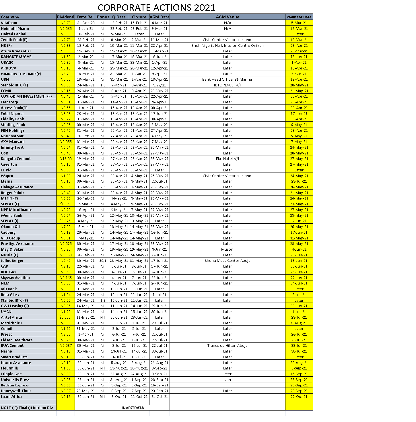 Equities NGX Corporate Actions As Of Friday, July 9, 2021 Editor July 9, 2021 1 min read 210 Post Views: 388 Continue Reading Previous: Investdata Price, Earnings Tracking For Week Ended July 9, 2021Next: Mixed Sessions Ahead On H1 Earnings, Dividend News, Inflation Index, MPC Meeting Trending Now SEC Nigeria Gives Capital Market Operators January 31 Deadline To Renew Registration 1 SEC Nigeria Gives Capital Market Operators January 31 Deadline To Renew Registration December 21, 2025 Investdata To Offer Tactical Trading Strategy For Higher Returns On NGX At 2026Q1 Master Class 2 Investdata To Offer Tactical Trading Strategy For Higher Returns On NGX At 2026Q1 Master Class December 20, 2025 Corporate Actions On NGX As Of Friday, December 19, 2025 3 Corporate Actions On NGX As Of Friday, December 19, 2025 December 20, 2025 Strong Buying Momentum Lifts NGX Index Above 152,000 Psychological Line On Heavy Volume 4 Strong Buying Momentum Lifts NGX Index Above 152,000 Psychological Line On Heavy Volume December 20, 2025 NGX Stretches Winning Streak To Seven Sessions As Broad Buying Keeps Bulls In Control 5 NGX Stretches Winning Streak To Seven Sessions As Broad Buying Keeps Bulls In Control December 19, 2025 Otedola Raises First HoldCo Plc Stake To 17.04% In Latest Deals 6 Otedola Raises First HoldCo Plc Stake To 17.04% In Latest Deals December 19, 2025 Related Stories Corporate Actions On NGX As Of Friday, December 19, 2025 1 min read Equities Corporate Actions On NGX As Of Friday, December 19, 2025 December 20, 2025 62 NGX Stretches Winning Streak To Seven Sessions As Broad Buying Keeps Bulls In Control 3 min read Equities NGX Stretches Winning Streak To Seven Sessions As Broad Buying Keeps Bulls In Control December 19, 2025 155 NGX Maintains Uptrend As Investors Accumulate Blue Chips Despite Slower Trading Activity 3 min read Equities NGX Maintains Uptrend As Investors Accumulate Blue Chips Despite Slower Trading Activity December 18, 2025 159 Cautious Buying Persists As Select Stocks Drive Marginal Market Upside 4 min read Equities Cautious Buying Persists As Select Stocks Drive Marginal Market Upside December 16, 2025 116 NGX Edges Higher Amid Selective Buying, Market Consolidates Near Recent Highs 3 min read Equities NGX Edges Higher Amid Selective Buying, Market Consolidates Near Recent Highs December 15, 2025 169 Corporate Actions On NGX As Of Friday, December 11, 2025 1 min read Equities Corporate Actions On NGX As Of Friday, December 11, 2025 December 13, 2025 198