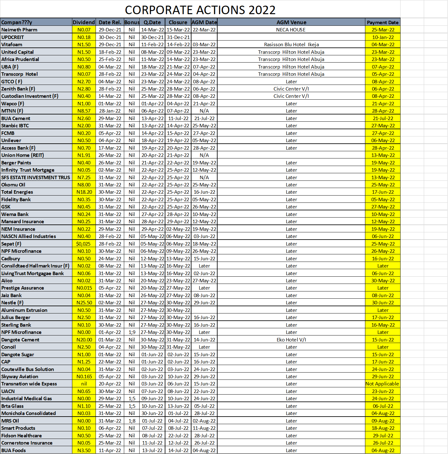 Equities NGX Corporate Actions As Of Friday, June 3, 2022 Editor June 4, 2022 1 min read 260 Post Views: 191 Continue Reading Previous: Investdata Price, Earnings Tracking For Week Ended June 3, 2022Next: Mixed Trend, Bargain Hunting On Pullbacks, Portfolio Repositioning Ahead Economic Data, Interim Dividend Trending Now NGX Consolidates As Bargain Hunting Counters Profit-Taking Amid Weak Volume 1 NGX Consolidates As Bargain Hunting Counters Profit-Taking Amid Weak Volume January 27, 2026 Oil Prices Steady But Supply Risks Persist 2 Oil Prices Steady But Supply Risks Persist January 27, 2026 Gold smashes $5,000, will it get to $6,000 this year? 3 Gold smashes $5,000, will it get to $6,000 this year? January 27, 2026 Bank Liquidation: NDIC, EFCC Agree Stronger Partnership For Asset Recovery, Prosecution Of Offenders 4 Bank Liquidation: NDIC, EFCC Agree Stronger Partnership For Asset Recovery, Prosecution Of Offenders January 26, 2026 Oil Prices Climb On Sanctions, Supply Risks 5 Oil Prices Climb On Sanctions, Supply Risks January 26, 2026 GDP: Nigeria Operating Far Below Its Productive Capacity 6 GDP: Nigeria Operating Far Below Its Productive Capacity January 25, 2026 Related Stories NGX Consolidates As Bargain Hunting Counters Profit-Taking Amid Weak Volume 3 min read Equities NGX Consolidates As Bargain Hunting Counters Profit-Taking Amid Weak Volume January 27, 2026 85 Corporate Actions On NGX As Of Friday, January 23, 2026 1 min read Equities Corporate Actions On NGX As Of Friday, January 23, 2026 January 24, 2026 136 NGX Ends Week On Cautious Positive Note As Selective Buying Offsets Profit-Taking Pressures 3 min read Equities NGX Ends Week On Cautious Positive Note As Selective Buying Offsets Profit-Taking Pressures January 24, 2026 135 NGX Ends Bearish On Heavyweight Selloffs Amid Cautious Sentiment 2 min read Equities NGX Ends Bearish On Heavyweight Selloffs Amid Cautious Sentiment January 23, 2026 199 Cautious Bargain Hunting Lifts Equities Marginally Amid Mixed Sector Performance 3 min read Equities Cautious Bargain Hunting Lifts Equities Marginally Amid Mixed Sector Performance January 22, 2026 175 Nigerian Equities Post Modest Rebound As Bargain Hunting, Oil Strength Support Market 3 min read Equities Nigerian Equities Post Modest Rebound As Bargain Hunting, Oil Strength Support Market January 21, 2026 194