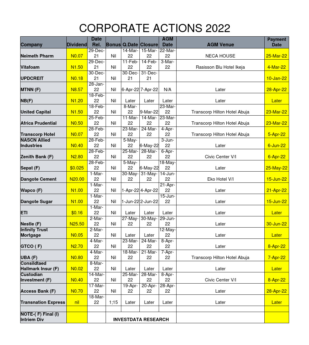 Equities NGX Corporate Actions As Of Friday, March 18, 2022 March 19, 2022 1 min read 282 Post Views: 203 Continue Reading Previous: Investdata Price, Earnings Tracking For Week Ended March 18, 2022Next: Mixed Sentiments, More Dividend Inflow, As Investors Bet On MPC Outcome Trending Now SEC Nigeria Mulls Green Energy Bonds, PPPs To Tackle National Power Sector Challenges 1 SEC Nigeria Mulls Green Energy Bonds, PPPs To Tackle National Power Sector Challenges January 1, 2026 NGX Closes 2025 Strong As Late Buying Lifts Banking Stocks, Market Breadth Improves 2 NGX Closes 2025 Strong As Late Buying Lifts Banking Stocks, Market Breadth Improves December 31, 2025 Presco Plc Says 103% Rights Issue Subscription Level Sign Of Strong Investor Confidence 3 Presco Plc Says 103% Rights Issue Subscription Level Sign Of Strong Investor Confidence December 31, 2025 Oil Prices Hold Steady On Tuesday Amid Global Tensions 4 Oil Prices Hold Steady On Tuesday Amid Global Tensions December 31, 2025 Nigerian Equities Sustain Rally As Liquidity, Sector Rotation Support Gains 5 Nigerian Equities Sustain Rally As Liquidity, Sector Rotation Support Gains December 30, 2025 UPDC 2025-9months: It’s a Hold, Amid Rising Profit, Shrinking Margins, Galloping Share Price Post-Turnaround 6 UPDC 2025-9months: It’s a Hold, Amid Rising Profit, Shrinking Margins, Galloping Share Price Post-Turnaround December 30, 2025 Related Stories NGX Closes 2025 Strong As Late Buying Lifts Banking Stocks, Market Breadth Improves 5 min read Equities NGX Closes 2025 Strong As Late Buying Lifts Banking Stocks, Market Breadth Improves December 31, 2025 81 Nigerian Equities Sustain Rally As Liquidity, Sector Rotation Support Gains 5 min read Equities Nigerian Equities Sustain Rally As Liquidity, Sector Rotation Support Gains December 30, 2025 120 Nigerian Stocks Extend Santa Claus Rally As Composite Index Hits Fresh High 5 min read Equities Nigerian Stocks Extend Santa Claus Rally As Composite Index Hits Fresh High December 29, 2025 226 Corporate Actions On Nigerian Bourse As Of Wednesday, December 24, 2025 1 min read Equities Corporate Actions On Nigerian Bourse As Of Wednesday, December 24, 2025 December 27, 2025 181 NGX Ends Christmas Eve Higher As Banking, Consumer Stocks Advance 5 min read Equities NGX Ends Christmas Eve Higher As Banking, Consumer Stocks Advance December 24, 2025 288 NGX Sustains Bullish Momentum As Buying Pressure Keeps Market On The Upside 5 min read Equities NGX Sustains Bullish Momentum As Buying Pressure Keeps Market On The Upside December 23, 2025 216