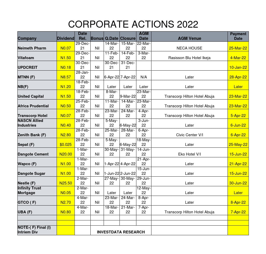 Equities NGX Corporate Actions As Of Friday, March 4, 2022 March 6, 2022 1 min read 337 Post Views: 300 Continue Reading Previous: Investdata Price, Earnings Tracking For Week Ended March 4, 2022Next: Positive, Bullish Sentiments May Linger On Inflow Of Dividend News, Positive Momentum Trending Now Oil Holds Steady Amid Geopolitical Risks, Surplus Outlook 1 Oil Holds Steady Amid Geopolitical Risks, Surplus Outlook December 16, 2025 NGX Edges Higher Amid Selective Buying, Market Consolidates Near Recent Highs 2 NGX Edges Higher Amid Selective Buying, Market Consolidates Near Recent Highs December 15, 2025 BUA Group Doles Out ₦30bn Cash Awards To 510 Employees 3 BUA Group Doles Out ₦30bn Cash Awards To 510 Employees December 15, 2025 Oil Prices Slide On Oversupply Concerns, Post 4% Weekly Loss 4 Oil Prices Slide On Oversupply Concerns, Post 4% Weekly Loss December 15, 2025 Nigerian Index Extends Two-Week Strong Buying Interests On Low Cap Stocks, Blue-Chip Gains 5 Nigerian Index Extends Two-Week Strong Buying Interests On Low Cap Stocks, Blue-Chip Gains December 13, 2025 Corporate Actions On NGX As Of Friday, December 11, 2025 6 Corporate Actions On NGX As Of Friday, December 11, 2025 December 13, 2025 Related Stories NGX Edges Higher Amid Selective Buying, Market Consolidates Near Recent Highs 3 min read Equities NGX Edges Higher Amid Selective Buying, Market Consolidates Near Recent Highs December 15, 2025 99 Corporate Actions On NGX As Of Friday, December 11, 2025 1 min read Equities Corporate Actions On NGX As Of Friday, December 11, 2025 December 13, 2025 119 Nigerian Bourse Rebounds Strongly, Index Gains 0.74% Amid Broad-Based Buying, Market Outlook Turns Firmer 3 min read Equities Nigerian Bourse Rebounds Strongly, Index Gains 0.74% Amid Broad-Based Buying, Market Outlook Turns Firmer December 11, 2025 130 NGX Index Slips Again As Broad Profit-Taking Persists, Investors Brace For Year-End Rebalancing 3 min read Equities NGX Index Slips Again As Broad Profit-Taking Persists, Investors Brace For Year-End Rebalancing December 10, 2025 65 Nigeria’s NGX Slips As Profit Taking Halts Rally Amid Cautious Investor Sentiments 3 min read Equities Nigeria’s NGX Slips As Profit Taking Halts Rally Amid Cautious Investor Sentiments December 9, 2025 37 Nigeria’s NGX Opens Week Strong As Bulls Tighten Grip, Banking Stocks Lead Momentum 4 min read Equities Nigeria’s NGX Opens Week Strong As Bulls Tighten Grip, Banking Stocks Lead Momentum December 9, 2025 16