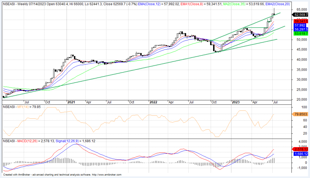 After testing the peak of 66,000 basis points which was recent resistance level, the NGX index’s action has formed an inverse hammer on a weekly chart and a decline phase on the daily time frame, a situation that supports a downtrend. However, this still needs confirmation in the new week, based on the market momentum currently which signals a continuation of trend or reversal on bargain hunting and re-valuation on expected Q2 corporate earnings.