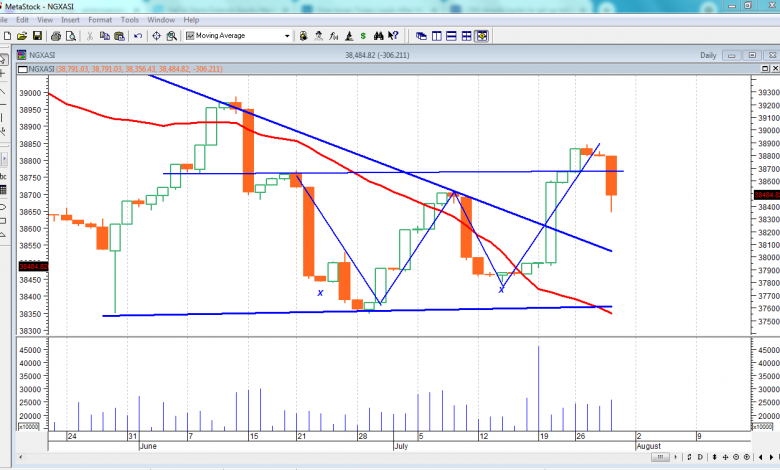 Thursday trading started on the downside and it was sustained till early afternoon before oscillating on bargain hunters taking advantage of the correction to positioning in mid-cap stocks with strong Q2 numbers. Meanwhile, the continued selloffs in blue chips stocks pushed the NGX index to an intraday low of 38,356.43 basis points from its highs of 38,791.03bps, and thereafter closed below its opening figure at 38,484.82bps on a high traded volume.