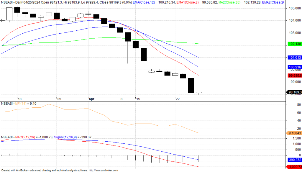 The NGX index’s action continued to trade below the T-line and 50-Day Moving Average, confirming the weak momentum while extending the decline phase, as the index witnessed another dip on above average traded volume and negative market internals to stay below the 8-day moving average exponential and 50 DMA to confirm continuation or reversal of trend depending on market forces and state of Q1 earnings reports of listed companies. As market players also look at corporate actions to position for dividend income. Although, we see fiscal and monetary policies trying to return the nation’s economy to the path of recovery, even with the continued mismatch of policies and implementation style. As declining oil production in the last months is a minus to the nation reserve.