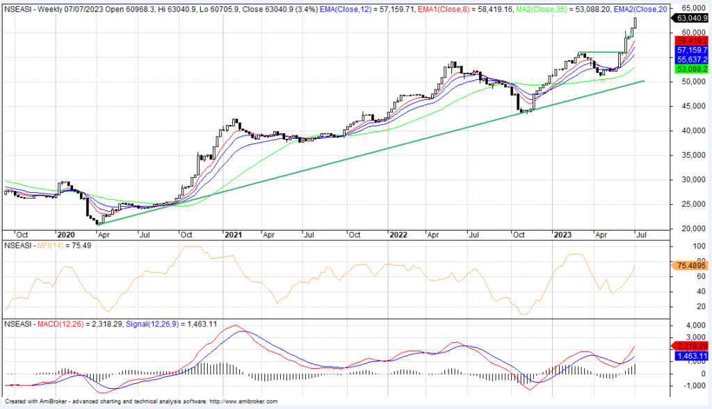 The NGX index’s action remained strong, trading above the 63,000 mark on positive sentiment in the midst of buying interests and bullish divergence on a weekly chart, while trading above the 100 DMA and 200 DMA on a high traded volume to sustain the uptrend on a weekly time frame that supports reversal and continuation of trend, which need to be confirm in the new week as pending financials are expected in the market. Also, the candlestick formation indicates that buyers are in charge ahead of earnings reporting season and MPC meeting that is around the corner.