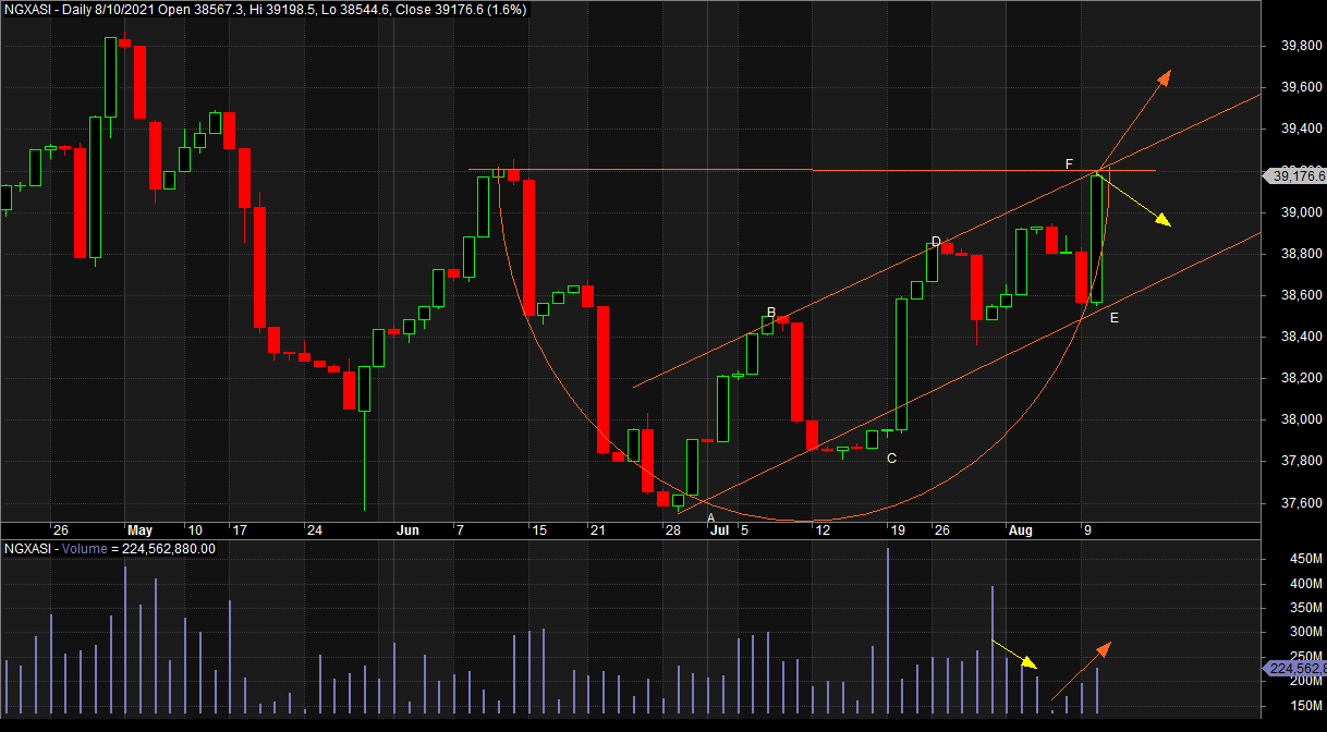Technically, the NGX index action is set to break out a strong resistance level of 39,210.10 basis points and a bullish channel on a new uptrend with high traded volume as of the close of trading on Tuesday. This was after it formed a saucer chart pattern that supports a continuation of the trend, which we need to confirm as the market opens for the midweek’s trading because correction is possible at this point or level. Below is the daily chart: