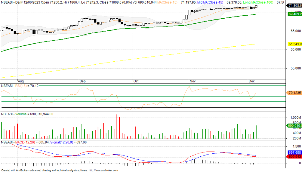 Midweek trading started in the upside and was sustained throughout the session on positioning in banking stocks and other blue chip companies, even as some stocks were hit with profit taking. This situation pushed the Index to an intraday high of 71,866.37bps from its lows of 71,242.31bps, before closing above its opening level at 71,808.64bps.
