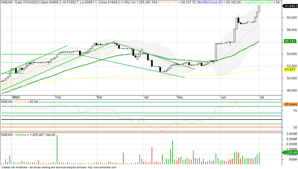 The index has broken another psychological line of 61,000 basis points and is heading to the 62,000 mark on an increased buying sentiment, trading at its 16-year market high on a high traded volume of transaction. In the process, many stocks have continued to hit new 52-week highs on inflow of fund and an expected fall in interest rates as the government looks to reform monetary policy after the recent unification the foreign exchange rates that made equity prices cheaper and more attractive on the exchange for foreign investors.