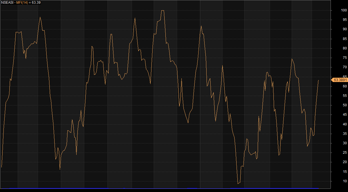 Market technicals were positive and mixed with lower traded volume than previous day in the midst of breadth favoring the bulls on positive sentiment, as revealed by Investdata’s Sentiments Report showing 98% ‘buy’ volume and 2% sell position. Total transaction volume index stood at 0.76 points, just as momentum behind the day’s performance was relatively strong, as seen in the 63.39.pts Money Flow Index, compared to previous day’s 57.59pts, indicating that funds entered the market.