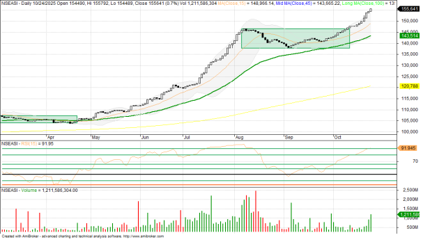 Investor sentiment is expected to remain positive in the near term, supported by continued gains by blue-chip stocks and increasing market liquidity. However, traders are advised to monitor key resistance levels and sector-specific developments, particularly in Financial Services and Consumer Goods, which continue to dominate trading activity. Any sharp corrections could present selective buying opportunities, while sustained bullish activity may propel the ASI toward the 158,000–160,000-point range in the coming weeks.
