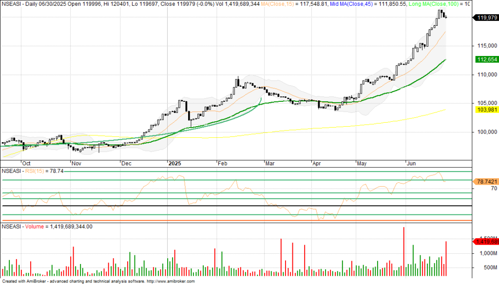 The last trading day of June on the Nigerian Exchange had a mixed session in the face of profit taking and end of the quarter window dressing to close flat on a very high traded volume and positive market breadth reflecting the month’s bullish momentum and positive outing, following which the benchmark NGX All-Share index returned 7.37% for the month. This sustained the second quarter uptrend to breakout various psychological lines between 113,000 and 121,000 basis point, hitting a new all time high of 121,264.20bps before pulling back on profit taking and portfolio rebalancing ahead of the Q2 earnings reporting season in the new month of July and Central Bank of Nigeria policy meeting later in the month.