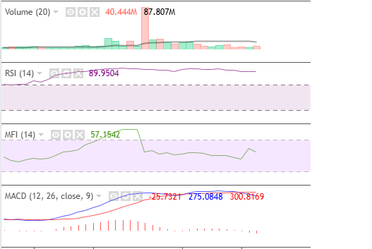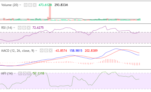 On the daily chart, MACD is bearish while MFI tilts downwards — though above 50. RSI remains high at 89.95, and volume remains low despite the strong bearish sentiment from the market. These indicators tell investors and traders that the market still has momentum, though profit-taking prevails.