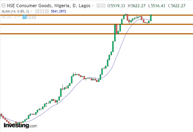 The NGXCSMG traded above the moving average and broke its resistance level at 5616.62. The price action conforms to the support level at 5463.29, starting a markup phase. Though the index price closed above its resistance level at 5622.27, the price hasn’t passed its 52-week high at 5640.80. When the price breaks its 52-week high, it will confirm a bull surge.